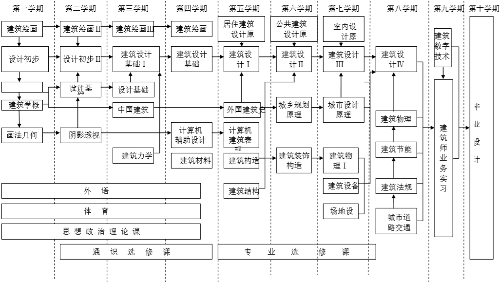 毛泽东思想和中国特色社会主义理论体系概论Ⅰ,毛泽东思想和中国特色社会主义理论体系概论Ⅱ,体育Ⅰ、Ⅱ、Ⅲ、Ⅳ,建筑设计基础Ⅰ、Ⅱ,居住建筑设计原理,公共建筑设计原理,建筑设计Ⅰ、Ⅱ、Ⅲ、Ⅳ,中国建筑史,外国建筑史Ⅰ、Ⅱ,建筑构造,建筑物理Ⅰ、Ⅱ。