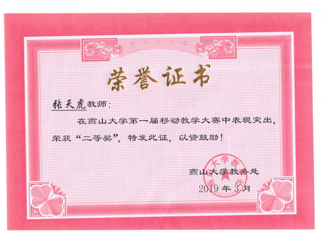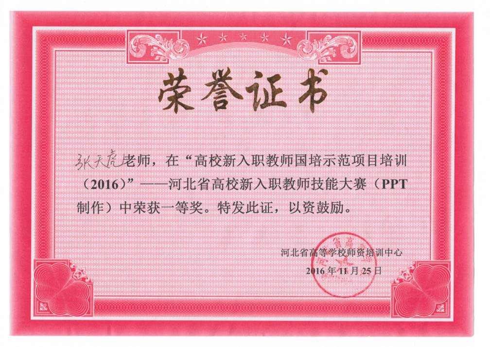 教育厅组织的高校新入职教师国培示范项目培训中获得了PPT制作一等奖。自2018年学校推广使用线上教学平台起,他又参加了教务处以及超星公司开展的多次培训,完成了多门课程的线上建设,并获得了成人论坛