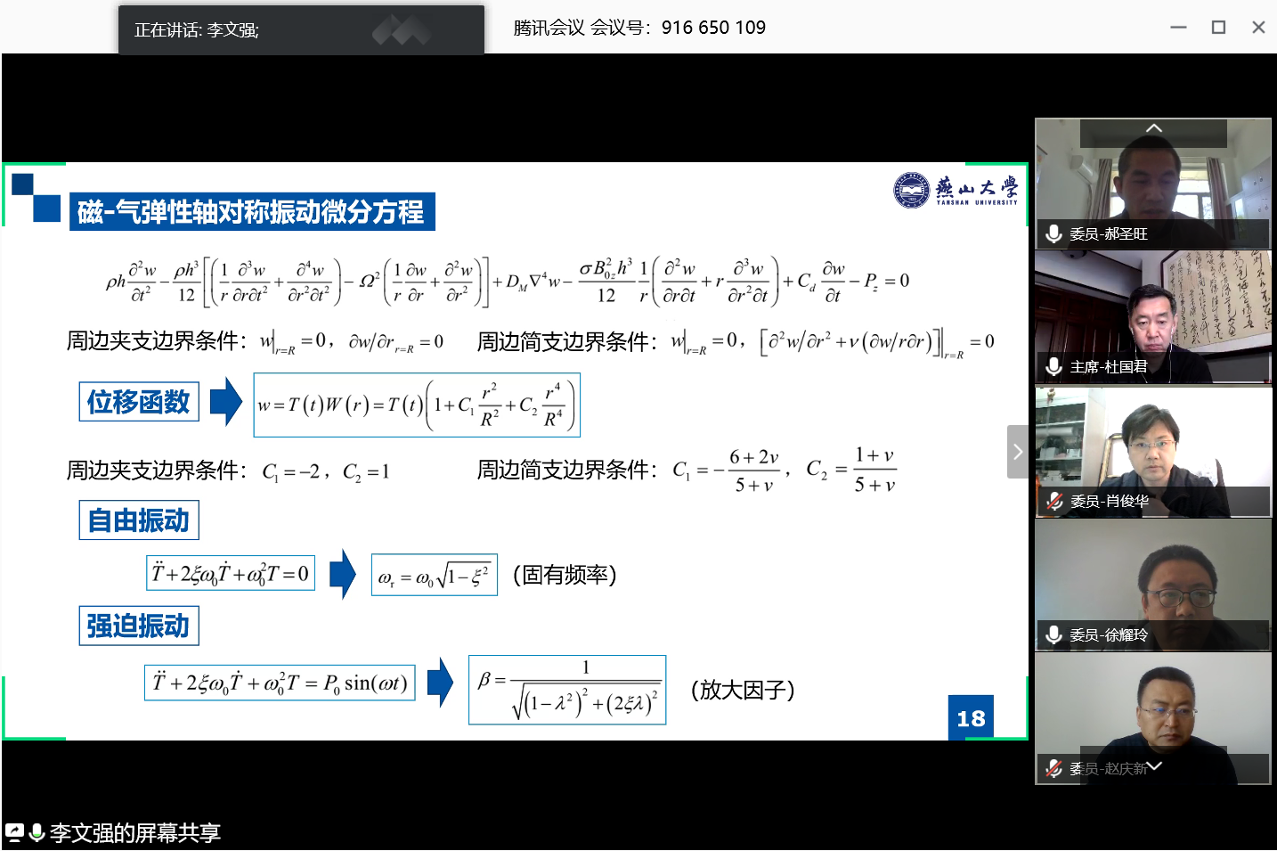 经过学院和工程力学系的精心准备,4月24日上午9点视频答辩会准时开始。正式答辩过程中,答辩人阐述论文、评委质询、答辩人回答问题、委员投票和评议,流程与线下答辩完全一致,各个环节紧张有序。经过近三个小时的视频答辩和会议讨论,李文强和刘泽良两位研究生顺利通过了博士学位论文预答辩。最后,答辩委员会主席杜国君教授宣读预答辩决议,本次预答辩在掌声中圆满结束。