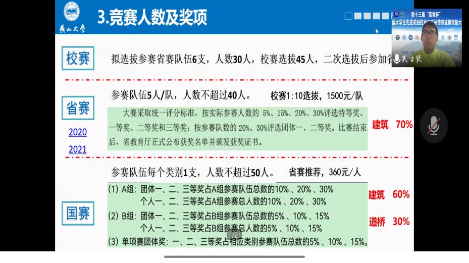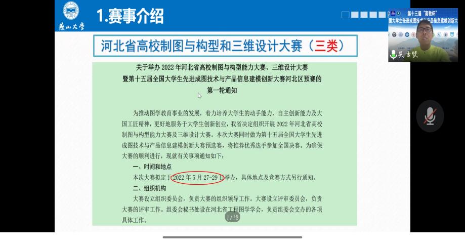 吴老师从全国大学生先进成图技术大赛赛事介绍讲起,详细介绍了赛事时间节点、奖项设置、竞赛内容、大赛今年的新要求以及备赛过程中需重点准备的内容等,使同学们更加深入全面地了解了比赛,受益匪浅;随后,吴老师强调,全国大学生先进成图技术大赛的根本宗旨是激发学生的学习兴趣和创新意识,提升学生专业软件应用能力,培养学生精益求精的工匠精神,参赛过程是创新实践的重要体验,对于学生自身成长有着积极的意义。吴老师鼓励与会同学积极备赛,提高自身能力,提升专业素养。在互动提问环节,同学们就参赛的一些具体事宜向吴老师进行了咨询。