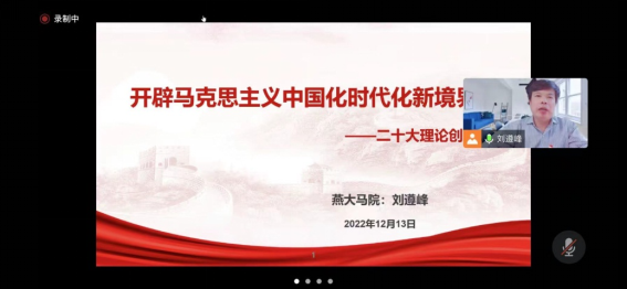 刘遵峰以《沁园春·雪》开篇,引出开辟马克思主义中国化时代化新境界这一主题。以党的二十大报告为文本依据,重点从三个维度阐释“开辟马克思主义中国化时代化新境界”这一重大论断。从“两个行”“两个结合”“两次飞跃”讲述了开辟马克思主义中国化时代化新境界的原因。通过分享《念奴娇·昆仑》,分析了关于习近平新时代中国特色社会主义思想、关于开辟马克思主义中国化时代化新境界最为重要的新概括——六个坚持。他强调,推进理论创新首先要把握好习近平新时代中国特色社会主义思想的世界观和方法论,坚持好、运用好贯穿其中的立场、观点、方法。他指出,中国共产党百年历史就是一部不断推进马克思主义中国化时代化的历史,马克思主义中国化时代化新境界体现了“两个结合”,就是把马克思主义基本原理同中国具体实际相结合,同中华优秀传统文化相结合。这“两个结合”很大地深化了我们党对坚持和发展马克思主义的规律性认识,也是我们理解和把握习近平新时代中国特色社会主义思想的关键。