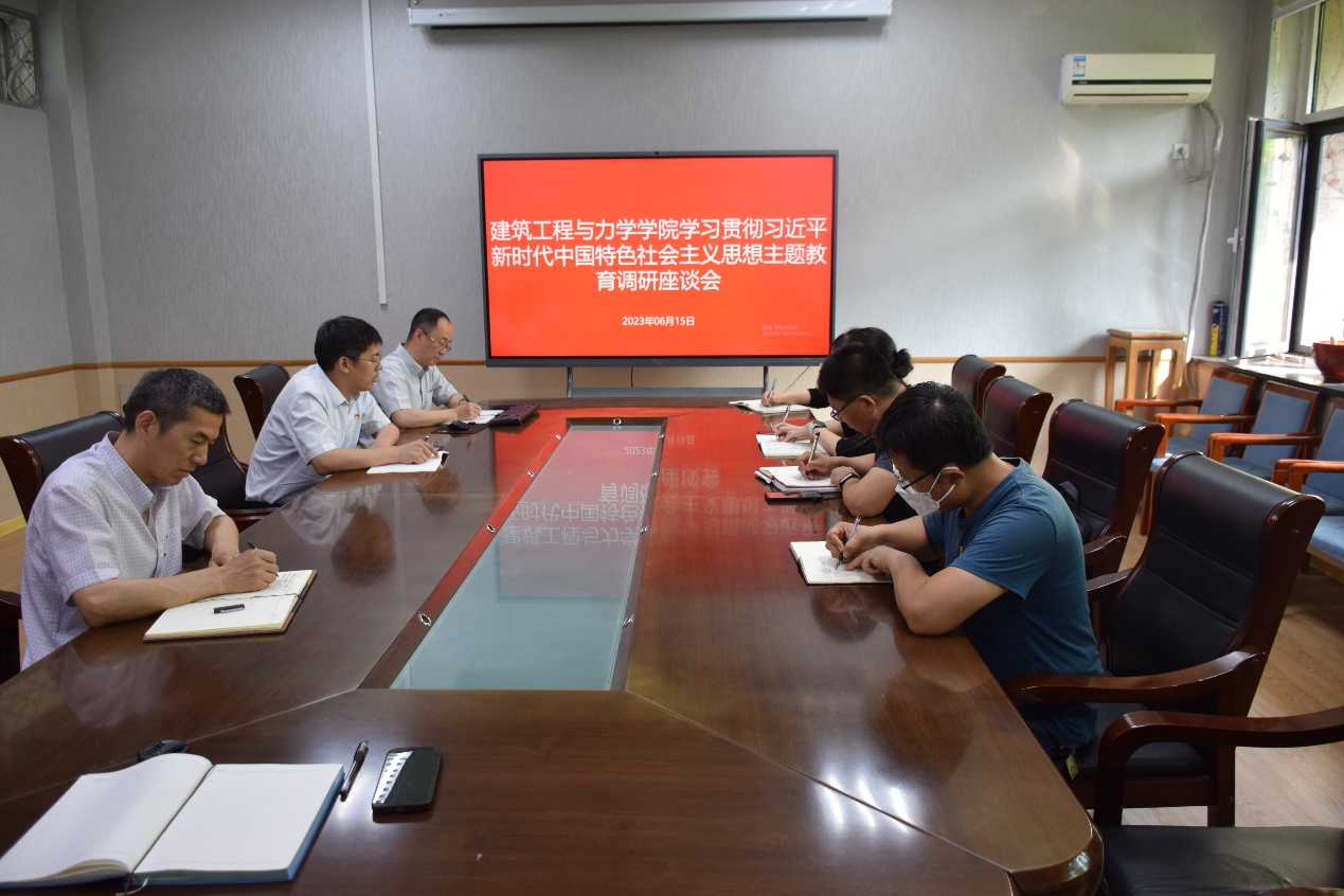在建筑馆203室召开学习贯彻习近平新时代中国特色社会主义思想主题教育调研座谈会。学院班子成员、主题教育领导小组办公室成员参加会议,会议由学院党委副书记王兵主持。