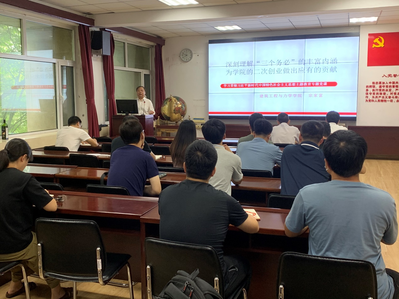 7月8日上午,学院党委书记宗家富在建筑馆211,面向学院领导班子成员、全体中层干部,以《深刻理解“三个务必”的丰富内涵、为学院的二次创业做出应有的贡献》为题讲授主题教育专题党课。宗家富指出,“三个务必”涵盖党的思想建设、作风建设等多方面要求,是进一步加强党的建设的有力抓手,全院师生党员,特别是领导干部同志,要牢记“三个务必”,投身学院事业发展。宗家富强调,全体党员干部一要不忘初心,心系广大师生;二要保持艰苦奋斗的作风,为学院二次创业接续奋斗;三要敢于斗争,迎难而上;四要有“功成不必在我、功成必定有我”的境界,不要搞急功近利的政绩工程,多做一些功在当代、利在长远的事情。
