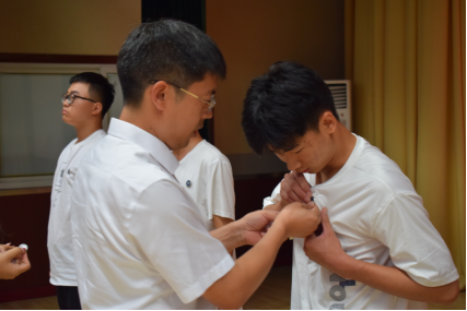 下午4点,典礼在雄壮的国歌声中拉开帷幕。五位院领导为来自全国不同地区的的40名新生代表佩戴校徽,沉甸甸的校徽,见证着新一代成人论坛