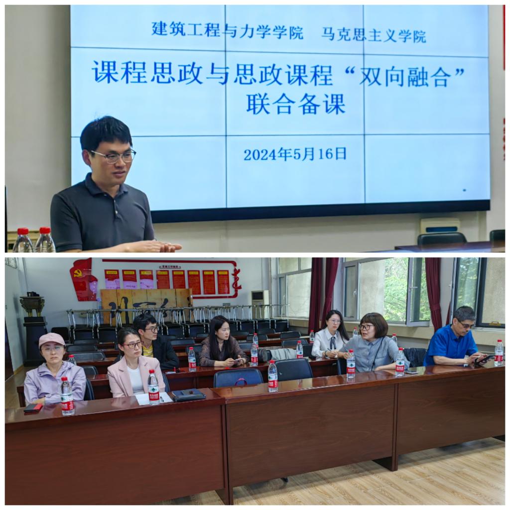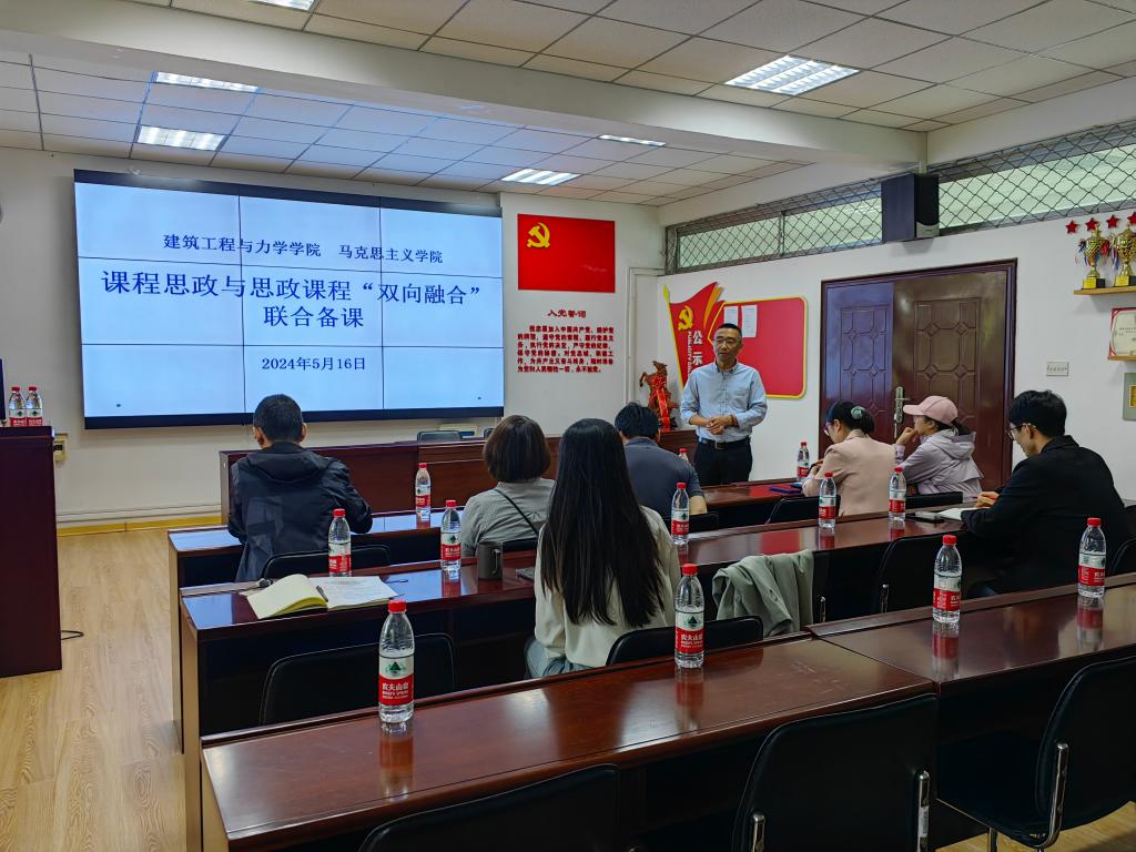 与马克思主义学院于2024年5月16日下午在建筑馆211室举办了课程思政与思政课程“双向融合”联合备课教研活动。活动由学院党委书记王继东主持,课程思政示范课程负责人、马克思主义学院有关思政课教师参加了此次活动。