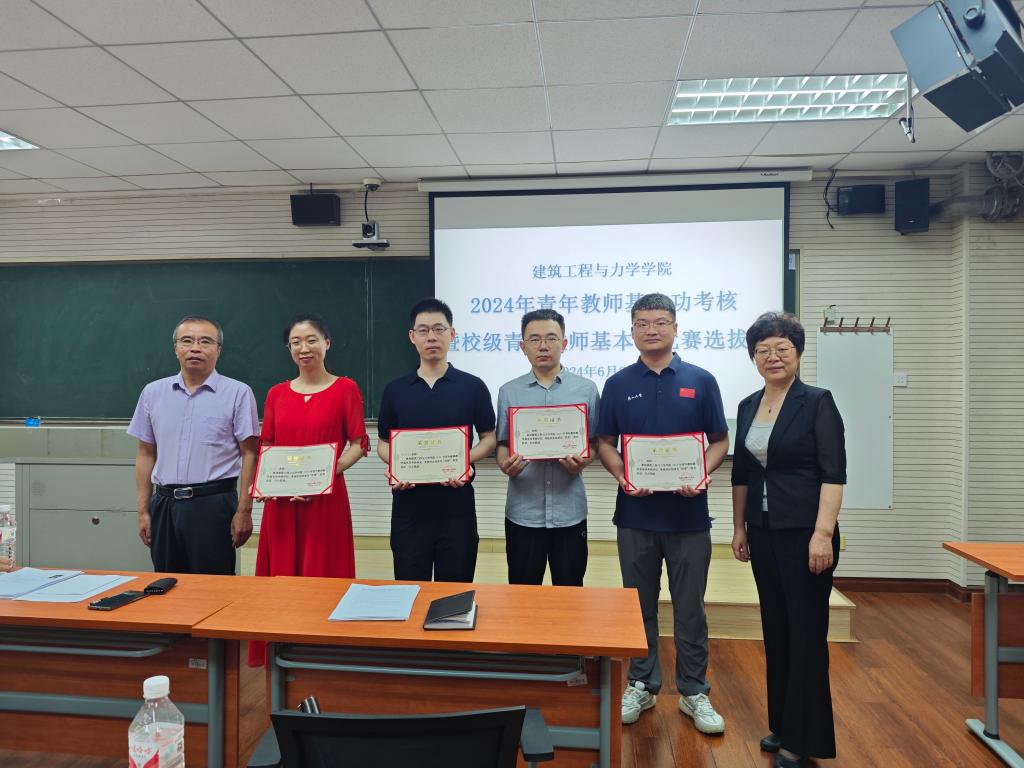 每位青年教师的考核分板书书写与绘图、教学设计汇报、现场课程教学展示3个环节。在板书书写与绘图环节,参加考核的教师需从学院提供的绘图题目中随机抽取一题在给定区域内进行展示,随后从学院提供的古诗词中随机抽取一首在黑板上书写。该环节既考核了青年教师的专业绘图能力,也考查了青年教师的板书书写功底,还提升了他们的人文素养。在教学设计汇报环节,参加考核的教师需用PPT对本人主讲课程的教学设计思路和内容进行汇报,该环节重在考查青年教师对课程的把握情况和教学设计思路。在现场课程教学展示环节,参加考核的教师需从教学日历中选取5次课做为考核备选内容,考核开始前从中随机抽取1次课进行授课展示。教师参加该环节的考核,需要对课程教学进行大量充分的准备,对教师的教学基本功是一次扎实的历练。两组教师考核完毕后,评委逐一进行了详细的点评,并给出了中肯的建议。经过一上午的比拼,最终4位教师被考核为优秀,其余教师均通过考核。