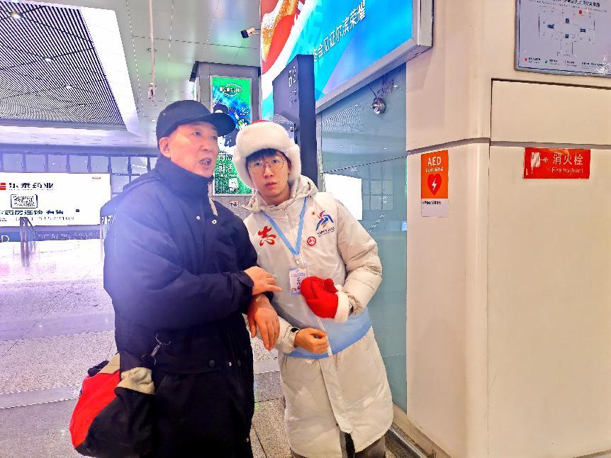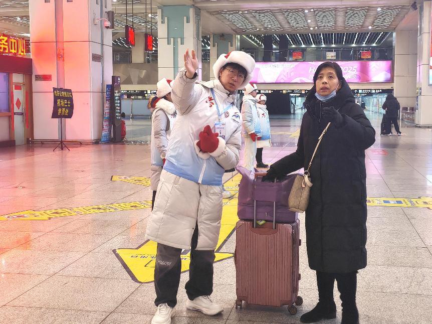 在哈尔滨西高铁站,武浩天同学头戴保暖帽子,身穿带有亚冬会标志的志愿服务马甲,专注地为身旁的游客进行指引。武浩天的身影活跃在车站各个角落,以专业和热情的服务,为游客及赛事参与者提供帮助,成为传递友好与温暖的使者。武浩天表示:“每当人们在我们的帮助下顺利出行,那种成就感是无法言表的。”正是这份对志愿服务的热爱,支撑着广大学子们在瑟瑟寒风中的坚守。