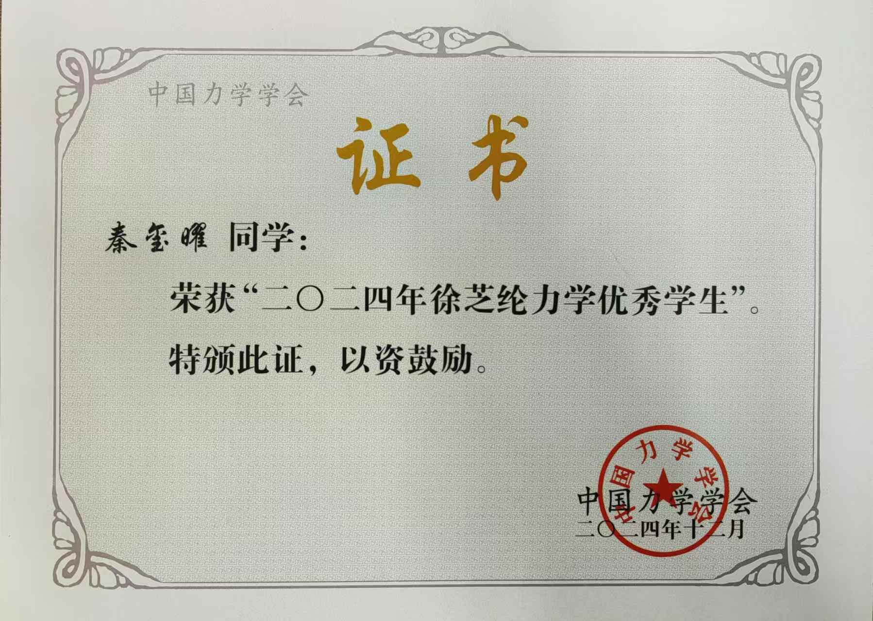 2021级工程力学专业秦玺曜同学榜上有名。全国徐芝纶力学优秀学生奖由徐芝纶基金会出资,中国力学学会设立,并由中国力学学会教育工作委员会承办,每两年评选一次。该奖项被誉为国内力学界的奥斯卡,旨在奖励高等学校理工科专业中刻苦学习力学课程,基本理论扎实,学习成绩优异,积极参与科研、学术创新的在校本科生。2024年全国总共评选100位学生获此殊荣。秦玺曜在众多推荐申报同学中脱颖而出,成为我校近5年来第2位获此殊荣的学生。
