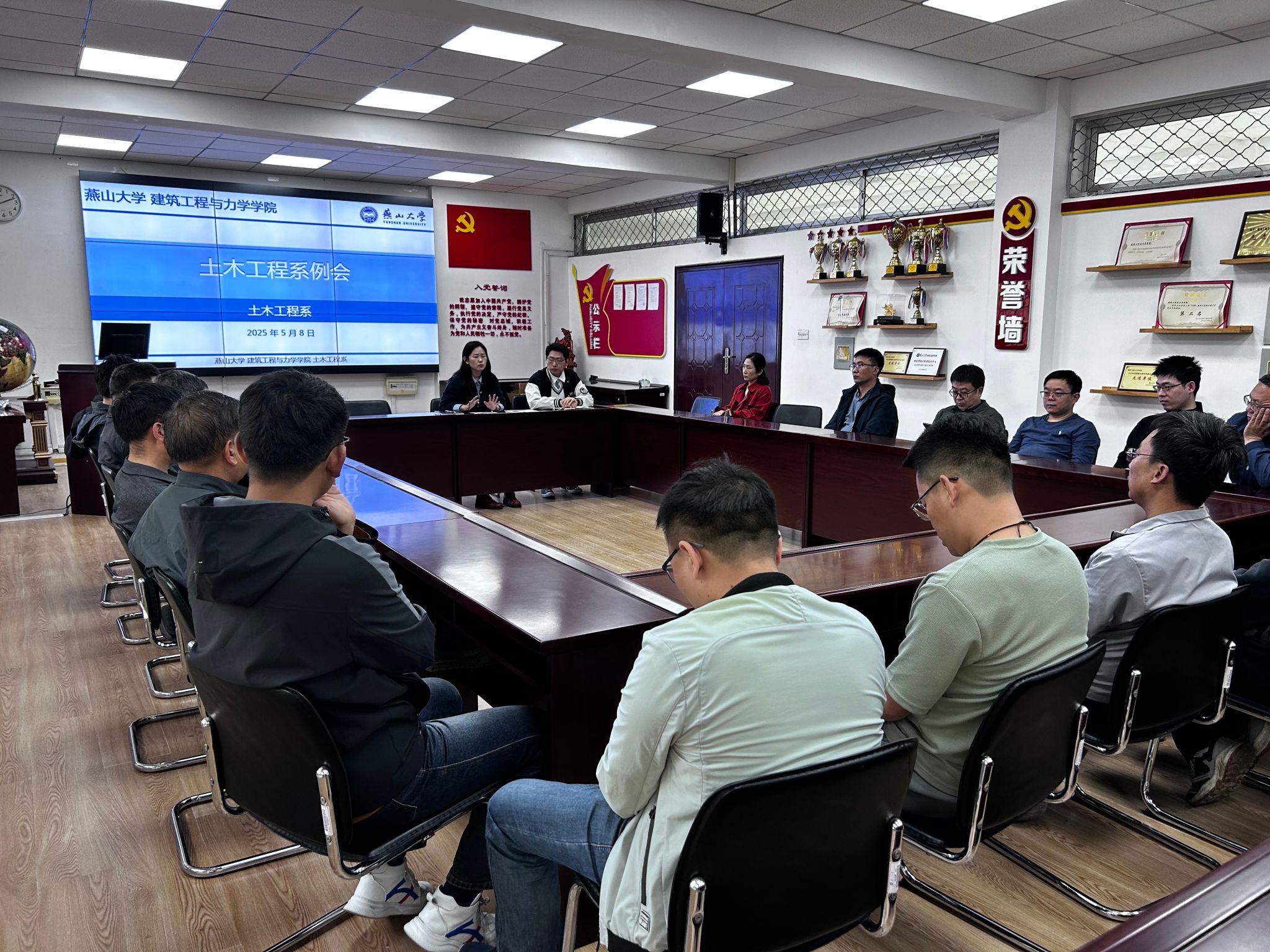 2025年5月8日,建工学院土木工程系召开专题系会,围绕师德师风建设、本科培养计划修订及智能建造方向课程规划等核心议题展开深入研讨。会议由土木工程系主任李雨浓主持,副主任杨烨凯及全系教师共同参会,共谋专业发展新路径。