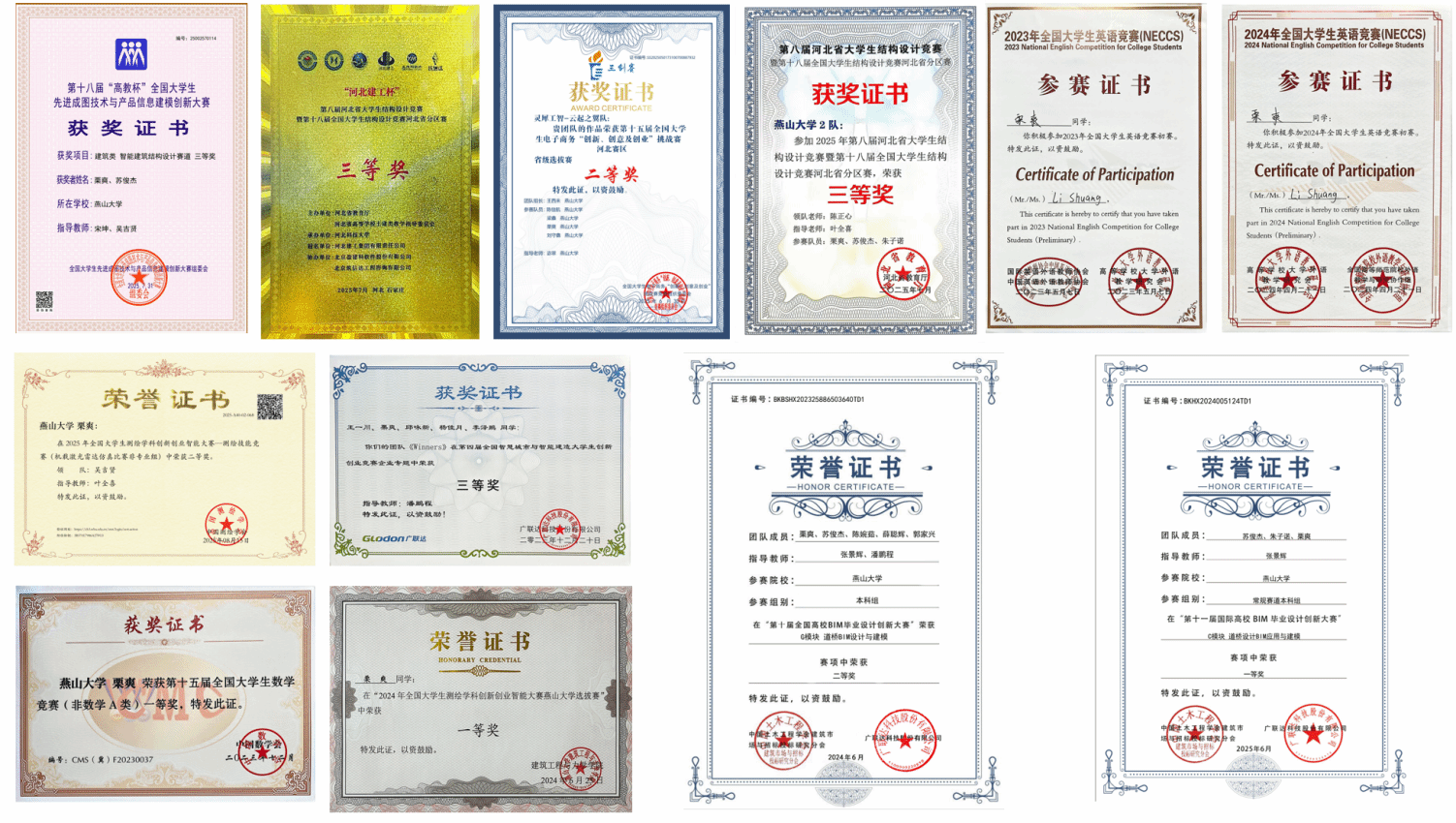栗爽先后取得第十一届国际高校BIM毕业设计创新大赛国家级一等奖、第十届全国高校BIM毕业设计创新大赛国家级二等奖(担任队长)、十八届先进成图大赛智能建筑结构设计赛道国家级三等奖(担任队长)、2025年全国大学生测绘学科创新创业智能大赛测绘技能竞赛国家级二等奖、第十五届全国大学生数学竞赛成人论坛